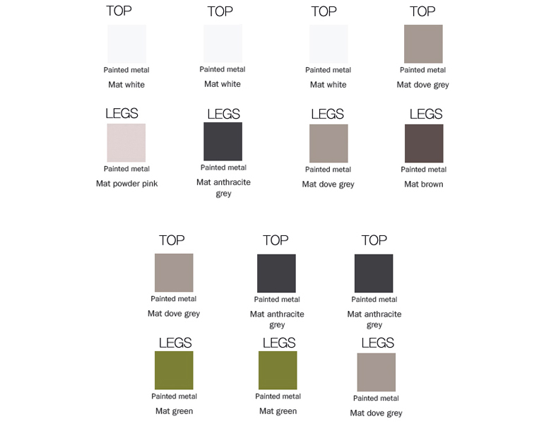 mat white / mat anthracite grey / Mat brown / mat dove grey / Mat powder pink / Mat coral red / Mat racing green / Mat green